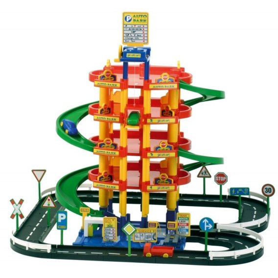 Rewelacyjny 5-poziomowy garaż, tor, parking cenionego producenta zabawek w zestawie z trzema autami to idealny pomysł na prezent. Dzięki produktom każde dziecko może zbudować swój własny mały świat. Wzorując się na przykładach z życia wziętych i przy odrobinie wyobraźni na Waszych oczach zaczną się tworzyć wspaniałe historie. Parking znajduje się na piętrach garażu.