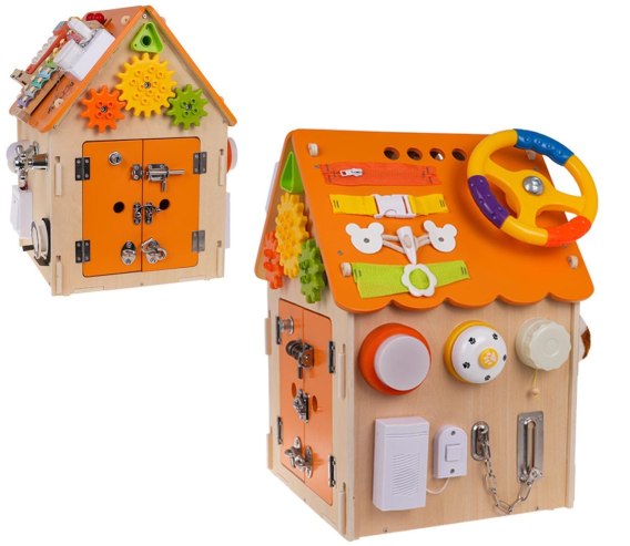 Wielofunkcyjny, drewniany domek z interaktywnymi funkcjami i zabawkami manipulacyjnymi. Na domku znajduje się aż 29 różnych atrakcji. Zabawka jest przeznaczona dla dzieci od 3-go roku życia. Konstrukcja wykonana jest z drewna i została pomalowana nietoksycznymi farbami. Solidne wykonanie i zaokrąglone krawędzie zapewniają bezpieczeństwo podczas zabawy.