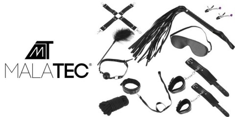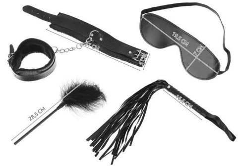 - 12 ELEMENTÓW - komplet składa się z: 2 par kajdanek na nogi i ręce, grubego sznura, maski na oczy, obroży ze smyczą, pejcza, knebla z piłeczką, pasków łączących kajdanki, opaski na oczy, packi do klapsów oraz zacisków na sutki. Dzięki swojej bogatej zawartości, pozwoli pozbyć się rutyny z każdej sypialni.