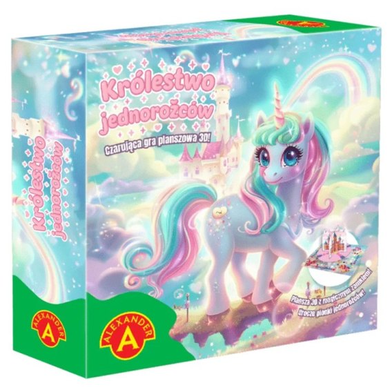 Witaj w bajkowej krainie pełnej magii, kolorów i uśmiechu! „Królestwo Jednorożców" to urocza gra planszowa, która przenosi dzieci do świata cudownego zamku w chmurach. Każdy gracz wciela się w kolorowego jednorożca i wyrusza na niezwykłą przygodę, aby odnaleźć pięć czarodziejskich przedmiotów - od podkowy szczęścia, przez diamentową koronę, aż po magiczną różdżkę.