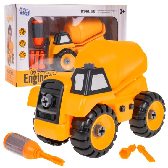 Zestaw, pojazd do skręcania ze śrubokrętem to propozycja dla małych konstruktorów od 3-go roku życia. Twoja pociecha może zdemontować pojazd i zmontować go ponownie. Pojazd wykonano z najlepszej jakości plastiku, można skręcać i rozkręcać go dowolną ilość razy, bez obawy o uszkodzenie elementów. W zestawie znajduje się śrubokręt z wymiennymi nasadkami. Betoniarka posiada podnoszoną, opuszczaną i obrotową gruszkę. |