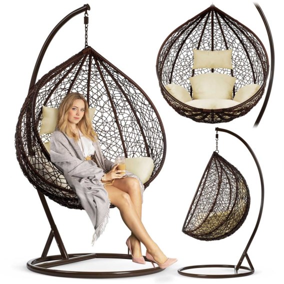 Fotel ogrodowy wiszący bujany Hawana brązowy + kremowe poduszki