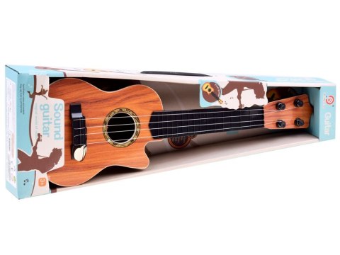 Instrument muzyczny w postaci gitarki to propozycja dla dzieci lubiących sprzęty muzyczne. Gabaryt gitary jest dopasowany dla najmłodszych, dzięki czemu jest łatwy w utrzymaniu i graniu. Świetny pomysł dla maluchów kochających muzykę oraz pragnących szlifować pierwsze gitarowe chwyty. Muzyka odgrywa ogromną rolę w rozwoju słuchu oraz sprawności fizycznej każdego dziecka. Dzieci mogą doskonalić poczucie rytmu, tworzyć własne melodie. Warto rozwijać talenty muzyczne oraz wprowadzić malucha w świat muzyki. Pasję należy rozwijać od najmłodszych lat, a taki instrument już pozwoli złapać pierwsze nawyki. Gitara w całości wykonana jest z plastiku w imitacji koloru drewna, dzięki czemu sprawia profesjonalne wrażenie. Posiada cztery metalowe struny, piórko do grania oraz opcję regulacji na gryfie.