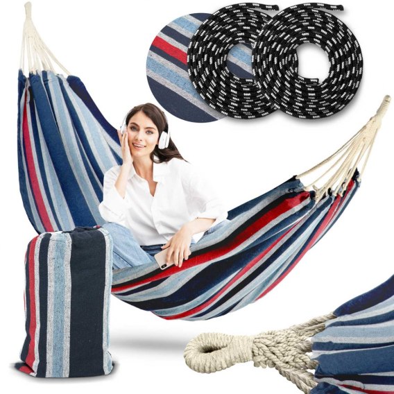 Wystarczy przywiązać krańce hamaka zakończone sznurami do drzew, słupków lub skorzystać z opcjonalnego stelaża aby cieszyć się wypoczynkiem na świeżym powietrzu.