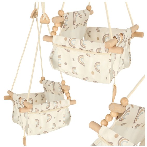 Drewniana zawieszka na huśtawce w formie tęczy będzie dodatkowym elementem, którym Twój maluch będzie mógł się bawić podczas spokojnego kołysania się. Tęcza i drewniane kuleczki będą rozwijać zdolności manualne malucha.