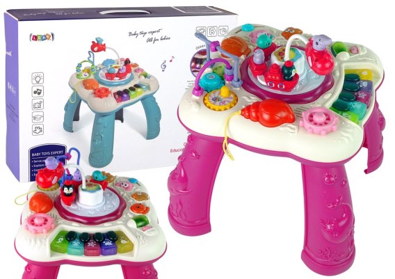 Stolik ma różowy kolor, morskie zwierzęta i figurki przeniosą go w świat morskich przestworzy. Nauczy się, jak wyglądają zwierzęta, a kolorowe diody i dźwięk sprawią, że zabawa będzie atrakcyjna. Elementy, które można nacisnąć, z pewnością zainteresują każde dziecko, ucząc równocześnie, jak używać swych rączek, by dotykać tego, co widzą ich oczka. Dodatkowo elementy nauczą dziecko jak chwytać, stymulować zmysł słuchu malucha.