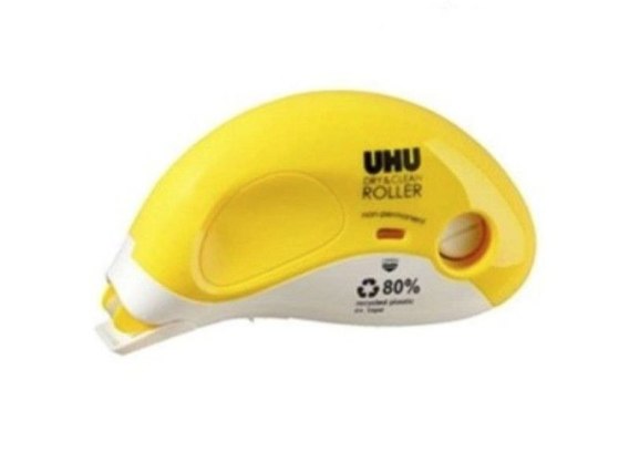 UHU Dry & Clean Roller. Do szybkiego, czystego i dokładnego klejenia papieru, tektury i zdjęć do siebie nawzajem i do wielu gładkich powierzchni. Z wbudowanym korkiem w celu ochrony taśmy przed zerwaniem. Dostępne dla stałego klejenia i niestałego zdejmowaną klejenia.