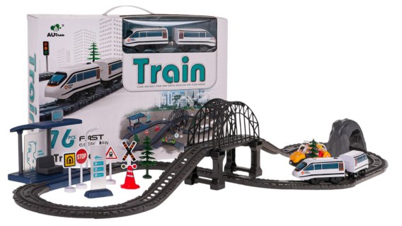 Zestaw kolejka z torami i akcesoriami dla dzieci od 3-go roku życia. Zestaw wykonany został z najlepszej jakości materiałów, tory posiadają mocne zaczepy. Na zestaw składa się 76 elementów: konstrukcja torów z mostem, tunelem i stacją, pociąg , znaki drogowe, jest też autko taxi z pasażerami. Pociąg zasilany jest bateriami typu 1 x AA 1,5 V (brak w zestawie), stacja bateriami typu 3 x AG3 1,5 V (w zestawie).