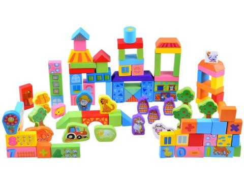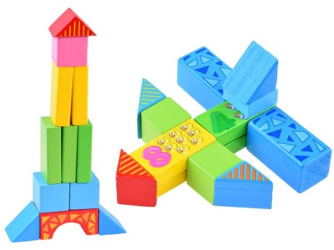Zestaw kolorowych klocków drewnianych w efektownych wzorach i kolorach przeznaczony jest dla każdego dziecka lubiącego tworzyć samodzielnie własne budowy. Z zestawu można zbudować budynki, farmę wyposażyć w zwierzątka, drzewa, kwiaty. Bardzo ładna kolorystyka i grafika zestawu zapewni piękne budowle. Drewniane klocki będą służyły długo i zapewnią dziecku wiele lat ciekawej i kreatywnej zabawy. Drewno jest ciepłe i przyjemne w dotyku. W dodatku to surowiec naturalny i w pełni ekologiczny.