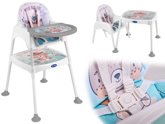 Krzesełko posiada aż trzy różne funkcje! Może służyć jako krzesełko do karmienia dla dzieci od 6 do 36 miesiąca życia, a gdy maluch stanie się za duży, możesz przemienić produkt w krzesełko i stolik. Taka kombinacja pozwoli nie tylko wygodnie zjeść posiłek, ale także świetnie sprawdzi się jako miejsce to rysowania i zabawy! W takiej formie posłuży bezproblemowo aż do szóstego roku życia!