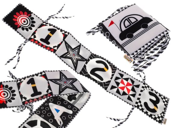 Magiczna materiałowa książeczka w kontrastowe wzory to świetna propozycja dla dzieci dopiero poznających świat. Znajdziesz w niej aż 12 różnch wzorów.