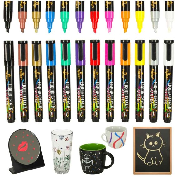 ● 12 kolorowych markerów kredowych: biały, czarny, czerwony, różowy, żółty, zielony, niebieski, fioletowy, pomarańczowy, brązowy, złoty i srebrny