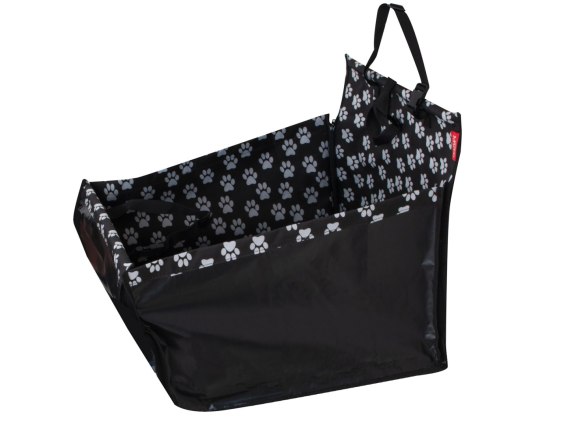 Mata samochodowa z uroczym wzorem białych odcisków łap na czarnym tle świetnie sprawdzi się podczas podróży z pupilem.