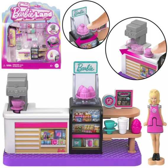 W zestawie znajduje się mini lalka Barbie o wysokości około 3,5 cm. Lalka jest w pełni dopasowana do wielkości zestawu, zgina się w talii, co umożliwia jej wygodne sadzanie przy stoliku lub za ladą. Dodatkowo posiada serduszkową podstawkę, kompatybilną z pozostałymi zestawami, pojazdami i domkami z serii Mini BarbieLand.