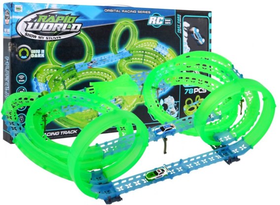 Duży tor świecący w ciemności to propozycja dla dzieci od 3-go roku życia. Zabawka zasilana jest bateriami typu 4 x AAA (brak w zestawie) - piloty oraz akumulatorami 2 x 3,7V (zawarte w zestawie) - samochody. Tor jest fluorescencyjny, świeci w ciemności. Samochodziki posiadają podświetlenie LED, jeżdżąc tworzą niesamowite efekty. Zabawa torem pozytywnie wpływa na koordynację wzrokowo-ruchową, budowanie toru pobudza wyobraźnię dziecka oraz rozwija zdolności manualne. |