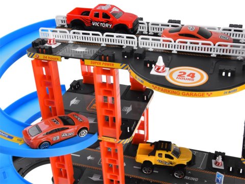 Wielopoziomowy parking samochodowy to super zabawa dla każdego chłopca. Spiralne zjazdy, ruchoma winda, znaki informacyjne, stacja benzynowa czy przystanek autobusowy są doskonałym uzupełnieniem zestawu. Parking posiada ruchomą windę, zjeżdżalnie, światła drogowe, znaki drogowe, dzięki, którym dzieci będą mogły wymyślać najróżniejsze opcje zabawy. Zestaw jest do samodzielnego złożenia. Zabawka świetnie sprawdzi się jako prezent dla każdego małego pasjonaty samochodów.