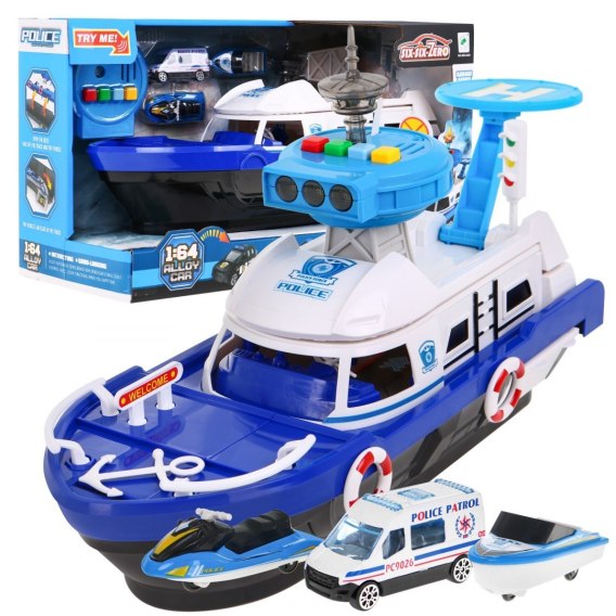 | - łódź policyjna z wieżą kontrolną, lotniskiem dla helikopterów, - doczepiana zjeżdżalnia, - furgonetka policyjna, - skuter wodny, - motorówka. |