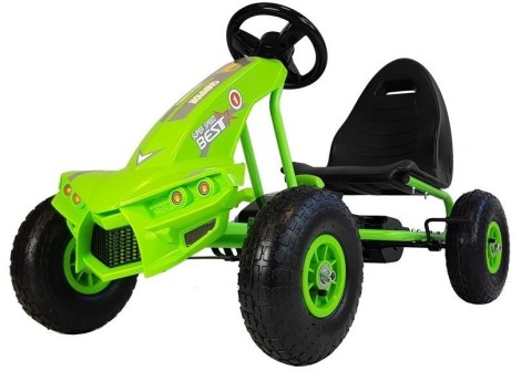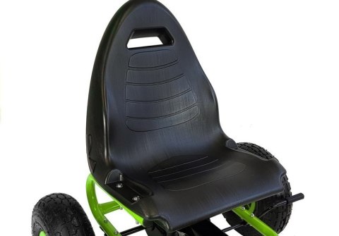 Ulokowanie zielonego gokarta na pompowanych kołach sprawia, że kierowca może jeździć swym dwuśladem po różnych nawierzchniach. Za komfort jazdy odpowiada czarny, szeroki fotel z opieraniem, a także kierownica o ergonomicznym kształcie. Udogodnienia te w połączeniu z dużymi kołami sprawiają, że prezentowany gokart sprosta Waszym wszystkim wymaganiom — sprawdźcie sami!
