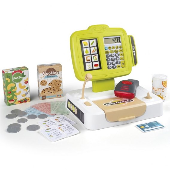 Kasa sklepowa z akcesoriami od Smoby to idealna propozycja zabawy dla dzieci. Dzieci mogą zważyć produkty, a następnie nabić je na kasę. Przy pomocy czytnika zeskanują ciasteczka, czy makaron. Następnie kupujący może zapłacić pieniążkami lub kartą płatniczą.