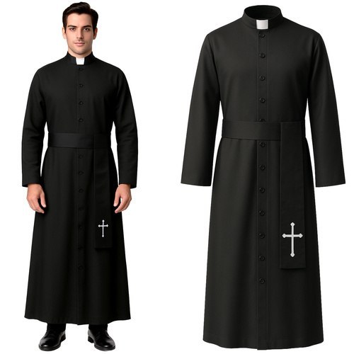 Klasyczny strój duchownego z czarną sutanną z koloratką oraz wiszący krzyż to gotowe przebranie, które świetnie sprawdzi się na Halloween, balu kostiumowym i przedstawieniu. Luźny krój i rozmiar XL/XXL zapewniają wygodę noszenia. Stylizacja przyciąga spojrzenia i nadaje charakter każdej imprezie.