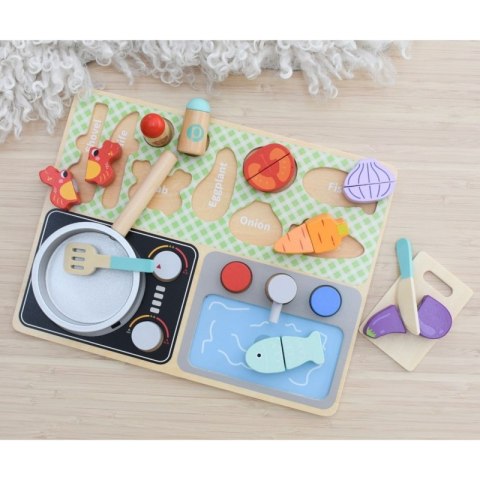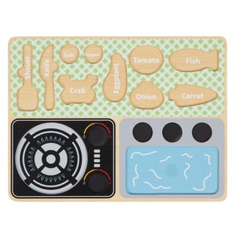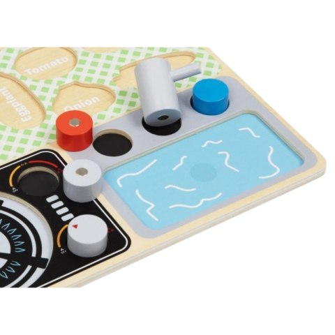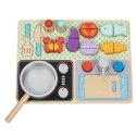 - ✔️ Wygodna plansza, dzięki którejdziecko poznaje nazwy warzyw, sztućców kuchennych i innych przedmiotów związanych z gotowaniem i jedzeniem