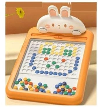 Tablica magnetyczna posiada kolorowe guziki, które można przesuwać przy pomocy magnetycznego długopisu i układać w przeróżne mozaiki, wzory i obrazki. Dziecko może wzorować się na dostępnych przykładach lub samodzielnie wymyślać nowe dzieła. Na tablicy znajduje się króliczek, który będzie towarzyszył maluchowi podczas zabawy.