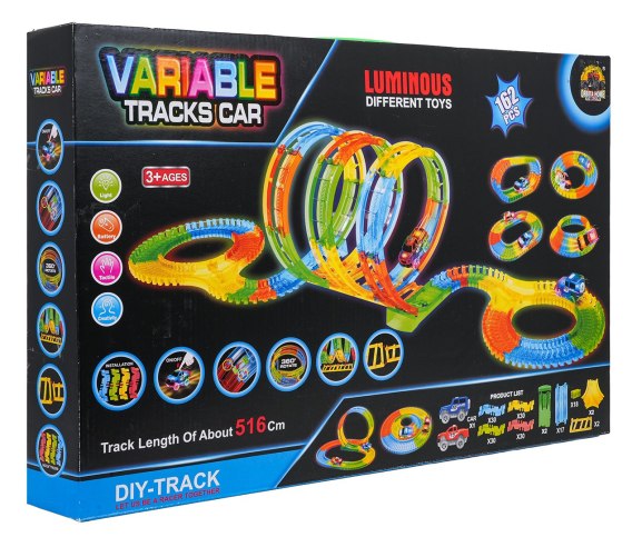 Tor wyścigowy świecący w ciemności z pętlami i autkiem w zestawie to propozycja dla dzieci już od trzeciego roku życia. Tory są elastyczne, można je układać w dowolne kombinacje, obracać, podnosić, przekładać i to podczas jazdy autka. Dodatkowo tory są fluorescencyjne, świecą w ciemności. Pojazd dołączony do zestawu, posiada podświetlenie LED, jeżdżąc w ciemności, tworzy niesamowity efekt. Pojazd zasilany jest bateriami 2 x AA 1,5V (brak w zestawie). Aby uruchomić autko, wystarczy nacisnąć na jego dachu przycisk.