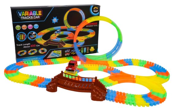 Tor wyścigowy świecący w ciemności z pętlą 360 stopni i autkiem w zestawie to propozycja dla dzieci już od trzeciego roku życia. Tory są elastyczne, można je układać w dowolne kombinacje, obracać, podnosić, przekładać i to podczas jazdy autka. Dodatkowo tory są fluorescencyjne, świecą w ciemności. Pojazd dołączony do zestawu, posiada podświetlenie LED, jeżdżąc w ciemności, tworzy niesamowity efekt. Pojazd zasilany jest bateriami 2 x AA 1,5V (brak w zestawie). Aby uruchomić autko, wystarczy nacisnąć na jego dachu przycisk.