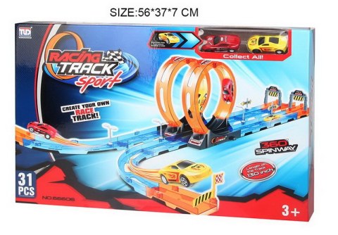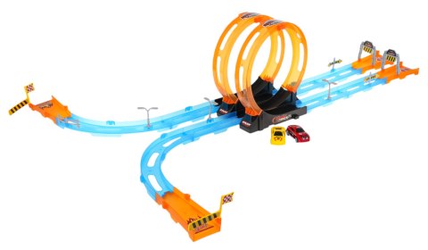 Podwójny tor wyścigowy z wyrzutnią dla dzieci od 3-go roku życia. Tor wykonano z najlepszej jakości plastiku w żywych kolorach. Na zestaw składa się 31 elementów do samodzielnego montażu. Tor posiada odcinki proste do rozpędzenia pojazdu, dwie pętlę 360 stopni i dwa pojazdy. Pojazdy napędzane są napędem pull back. Wystarczy delikatnie nacisnąć pojazd do tyłu, by przejechał tor z pełną mocą. Funkcje toru: - odpowiedni dla dzieci od 3-go roku życia, - wykonany z najlepszej jakości plastiku w żywych kolorach, - pętle 360 stopni, - możliwość zabawy dla dwóch osób jednocześnie, - pojazdy z napędem pull back |
