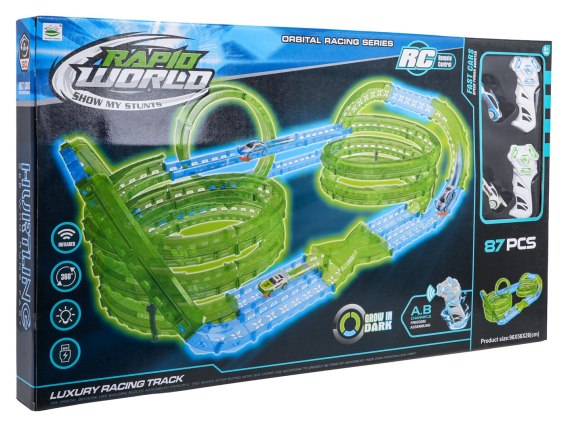 Duży tor wyścigowy świecący w ciemności to propozycja dla dzieci od szóstego roku życia. Zestaw składa się z dwóch pilotów, dwóch samochodów i części konstrukcyjnych toru. Piloty zasilane są bateriami typu 2 x AAA (brak w zestawie), samochody akumulatorami typu 3,7V (zawarte w zestawie). Tor jest fluorescencyjny, świeci w ciemności. Samochodziki posiadają podświetlenie LED, jeżdżąc, tworzą niesamowite efekty. Zabawa torem pozytywnie wpływa na koordynację wzrokowo-ruchową, budowanie toru pobudza wyobraźnię dziecka oraz rozwija zdolności manualne.