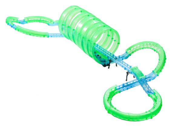 Duży tor wyścigowy świecący w ciemności to propozycja dla dzieci od szóstego roku życia. Zestaw składa się z dwóch pilotów, dwóch samochodów i części konstrukcyjnych toru. Piloty zasilane są bateriami typu 4 x AAA (brak w zestawie), samochody akumulatorami typu 3,7V (zawarte w zestawie). Tor jest fluorescencyjny, świeci w ciemności. Samochodziki posiadają podświetlenie LED, jeżdżąc, tworzą niesamowite efekty. Zabawa torem pozytywnie wpływa na koordynację wzrokowo-ruchową, budowanie toru pobudza wyobraźnię dziecka oraz rozwija zdolności manualne.