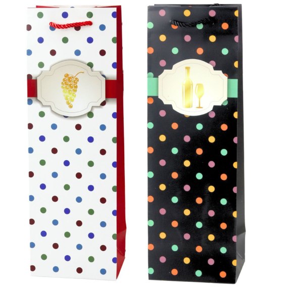 Elegancka torebka prezentowa na wino to idealne rozwiązanie, aby w wyjątkowy sposób zapakować butelkę alkoholu lub inny upominek o podobnym kształcie. Klasyczny design w kolorowe kropki, uzupełniony złotym motywem butelki i kieliszka.