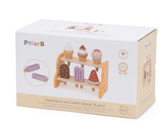W komplecie znajduje się drewniany stojak z dwoma półkami, na których można ustawić różne rodzaje lodów: trzy rożki z lodowymi kulkami, lody na patyku oraz słodki kawałek lodowego arbuza. Dzięki otworom w półkach dziecko może łatwo wkładać i wyjmować lody, ucząc się porządku i rozwijając koordynację ręka-oko.