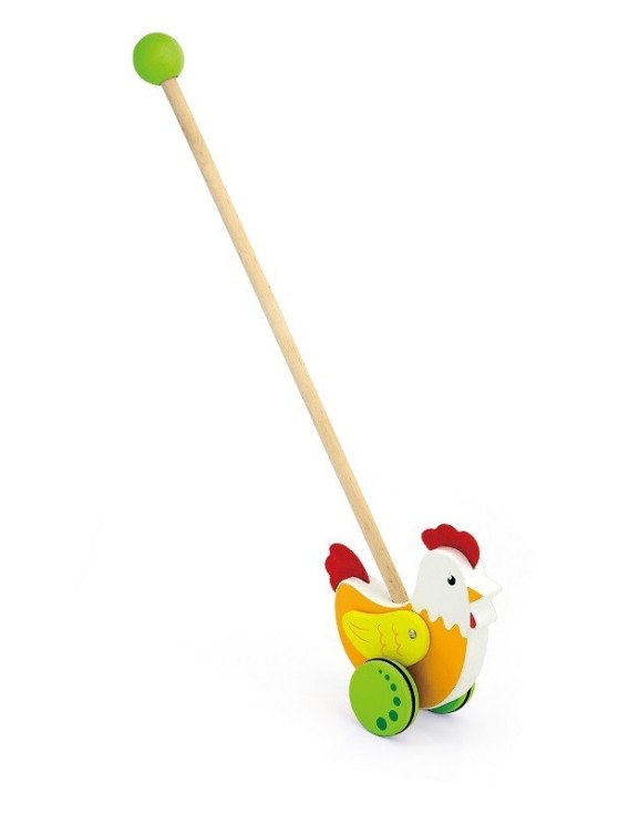 Pchacz z kurką na kijku od firmy Viga jest przeznaczona dla dzieci, które właśnie uczą się stawiać pierwsze kroki. Kolorowa pchacz na pewno zachęci maluszka do doskonalenia techniki chodzenia. Idealna zabawka, która sprawdzi się podczas wspólnych spacerów.Do naszego pchacza przyczepione są drewniane skrzydła, które w zabawny sposób imitują jego ruch. Dodatkowym atutem są gumy antypoślizgowe, które mieszczą się na drewnianych kółkach. Dzięki temu zabezpieczają dziecko przed poślizgiem oraz chronią naszą podłogę.
