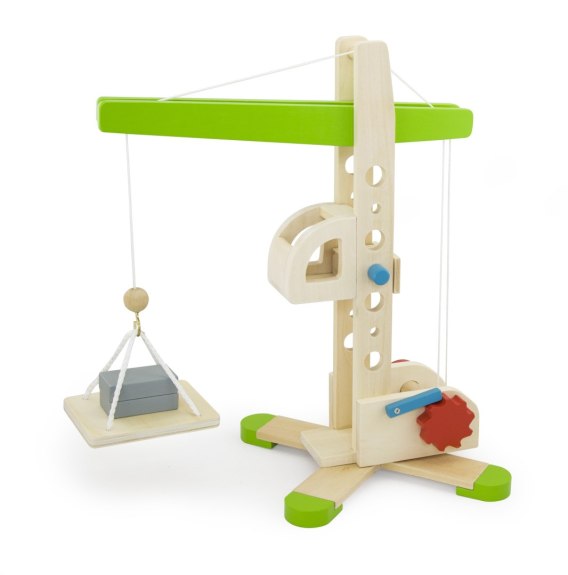 Żuraw umieszczany jest na krzyżowej podstawie, na której może obracać się o 360 stopni. Kabina operatora można przemieszczać dowolnie w górę lub w dół, oraz zatrzymać na dowolnej wysokości za pomocą wyciąganego kołeczka. Ramię dźwiga wyposażone jest w sznureczek, który pozwala na opuszczanie i podnoszenie klocków. Podnieś i obróć dźwig - zapadkowe koło zębate zablokuje się! Twój ładunek jest bezpieczny! Dodatkowo w opakowaniu znajdują się dwa drewniane bloczki.