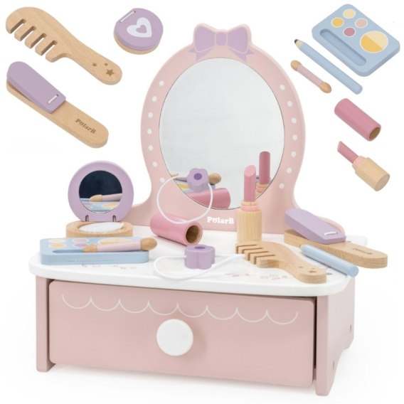 Śliczna, drewniana toaletka z marki Viga to idealny zestaw do zabawy dla każdej dziewczynki, która lubi przebieranki, zabawę w dom czy salon piękności. Zaprojektowana w pastelowych kolorach, z bezpiecznym lusterkiem i mnóstwem uroczych dodatków, sprawi dziecku mnóstwo radości i zajmie je na długie godziny.Ta urocza, drewniana toaletka to nie tylko zabawka - to brama do świata fantazji i kreatywnej zabawy!