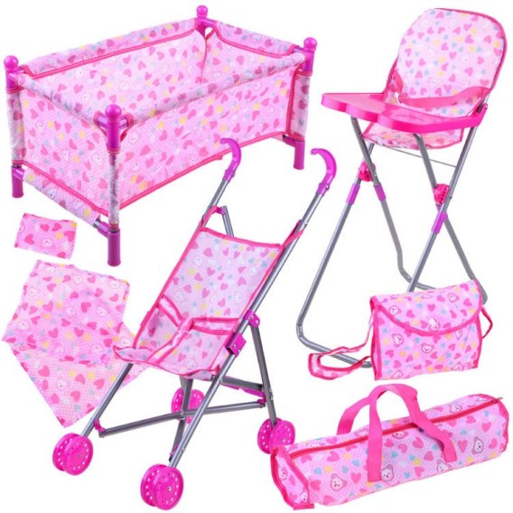 Wieloelementowy zestaw dla lalek to propozycja dla każdej małej opiekunki. Zestaw składa się z łóżeczka turystycznego, wózka spacerówki i krzesełka do karmienia. Dodatkowo w zestawie znajduje się torebka oraz pokrowiec na łóżeczko.
