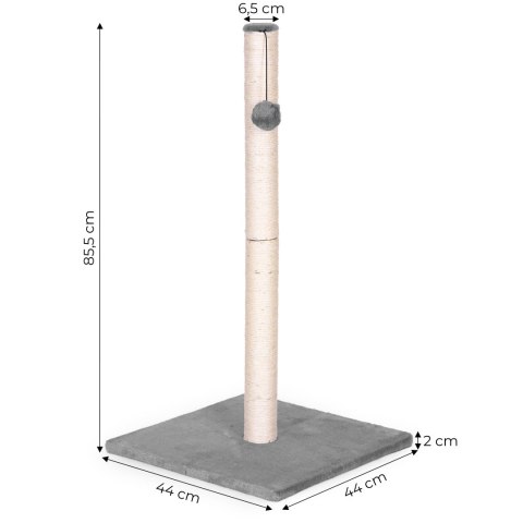 Do wierzchołka słupka przyczepiona jest miękka piłeczka na gumce. Wisząca zabawka z pewnością zainteresuje twojego kota, zapewni mu rozrywkę i zachęci go do aktywności. Sam słupek opleciony jest specjalnym sznurem sizalowym, dzięki temu Twój pupil może do woli go drapać, dbając przy tym o swoje pazury.