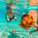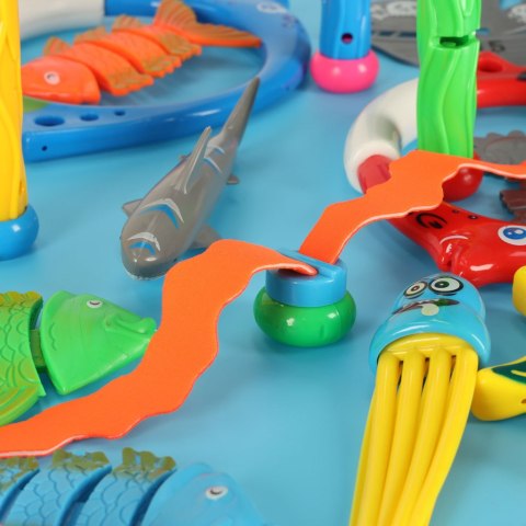 Umieszczone w basenie rybki, koniki morskie i ośmiornice są elementem zabawy, w której dziecko może rozwinąć zręczność i motorykę. Komplet zawiera rurki do nurkowania, które pomogą dziecku wyłowić zabawki z wody.