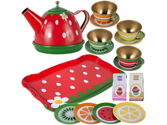 Tacka, filiżanki, talerzyki oraz czajniczek są metalowe, dzięki czemu są o wiele trwalsze od plastiku i na pewno długo posłużą.