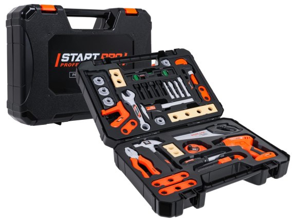 Bogato wyposażony zestaw narzędzi z interaktywną wiertarko-wkrętarką oraz skrzynką narzędziową dla dzieci powyżej trzeciego roku życia. Zestaw wykonany został z najlepszej jakości plastiku i posiada aż 34 elementy. Prócz dużej skrzynki na narzędzia, wyglądającej profesjonalnie w zestawie mamy też: wiertarko-wkrętarkę z wymiennymi bitami, suwmiarkę, klucz do śrub, metr, śrubokręt, młotek, piłę ręczną, kombinerki, oraz wiele śrubek, nakładek, drewienek do wkręcania.