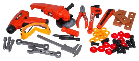 - torba na narzędzia, - wiertarko-wkrętarka, - szlifierka, - suwmiarka, - klucz nastawny, - klucz oczkowy i płasko-oczkowy, - nasadka do śrubokręta, - nożyk, - kombinerki, - okulary ochronne, - 7 x element do wkręcania śrubek, - 3 x końcówka do wkrętarki, - 10 x nakrętka, - 10 x śruba, - wkrętarka, - 2 x bit do śrubokręta, |