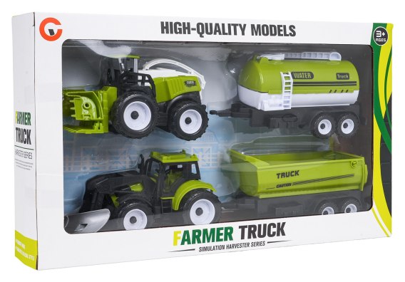 Zestaw pojazdów rolniczych dla dzieci powyżej trzeciego roku życia. Zestaw wykonano z najlepszej jakości plastiku. W zestawie znaleźć możemy kombajn, traktor z pługiem, cysternę oraz przyczepę. Pojazdy zostały wykonane bardzo realistycznie z dbałością o szczegóły i mają wiele ruchomych elementów. Przyczepkę i cysternę możemy doczepiać zarówno do traktorka jak i kombajnu.