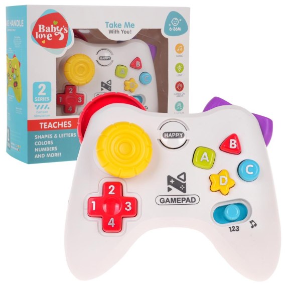 Interaktywny pad z efektami dźwięku i światła dla najmłodszych od 6-go miesiąca życia. Pad wykonany został z najlepszej jakości plastiku i jest w pełni bezpieczny dla maluszka. Pod każdym przyciskiem, kryją się migoczące światełka i dźwięki. Pad może działać w dwóch trybach: muzyczno-dźwiękowym lub edukacyjnym. W trybie edukacyjnym dziecko poznaje literki, cyferki, kształty i kolory. Na górze pada, znajdują się dwa elementy do kręcenia, które przesuwając się, wydają dźwięki terkotania. Zabawka zasilana jest bateriami typu 3 x 1,5 V AAA, których brak w zestawie.